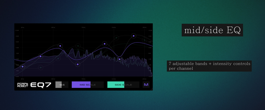 - A mixing/mastering mid/side EQ, with 7 bands (bell filters) for each channel (14 total) , with adjustable/automatable scale parameters for each channel
