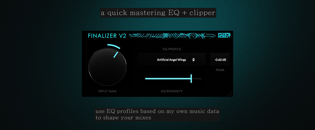 - A fast mastering/mixing tool, which is essentially some EQ profiles + a hard clipper. The EQ profiles are based around my real song and mixing/mastering data, which are the EQ curves used to master my own released music. Compared to the free V1 version, V2 has more EQ Profiles + an intensity control which adjusts the EQ amount